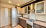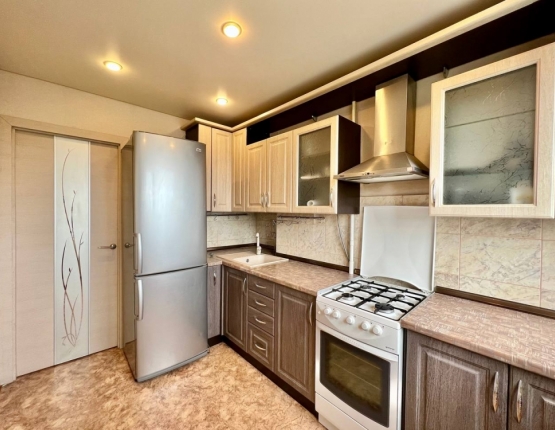 На кухне установлен гарнитур, газовая плита, вытяжка и холодильник — всё остаётся новым владельцам.