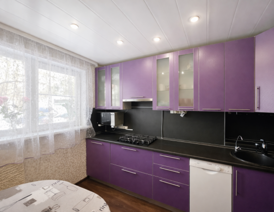 Кухня площадью 9 м² — просторная и аккуратная. Установлен современный кухонный гарнитур со встроенной техникой, всё остаётся новому владельцу.